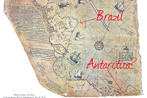 Pirî Reis, haritasını Cenevizli Colomb ve Toscanelli’den faydalanarak çizdiğini kendisi belirtmektedir. Ancak iki haritada da yüzlerce hata varken Pirî Reis bu hataları neden tekrarlamamıştır? Ayrıca Antarktika’yı nereden bilmiştir. Harita bilimsel yollarla çizildiği ve tekniğinin de açıklandığı kesindir. Haritanın üzerinde 9 Mart- 7 Nisan arasında 29 günde Gelibolu’da Pirî Reis tarafından çizildiği yazılıdır. Üstelik haritasının doğruluğundan emindir Pirî Reis. Harita ile ilgili şiirinde “ Kıl kadar farketmez, bilin” der. Nasıl bu derece emin olabilmiştir? Ve şiirinde ipuçlarını da vermektedir. Pirî Reis: